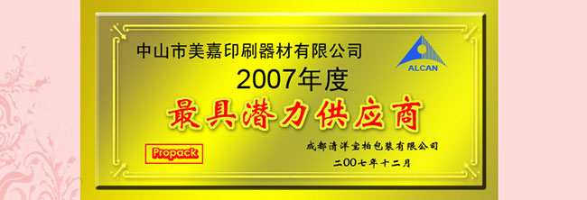 2007年12月,榮獲 ALCAN 集團成都清揚寶柏公司2007年度“最具潛力供應(yīng)商獎”